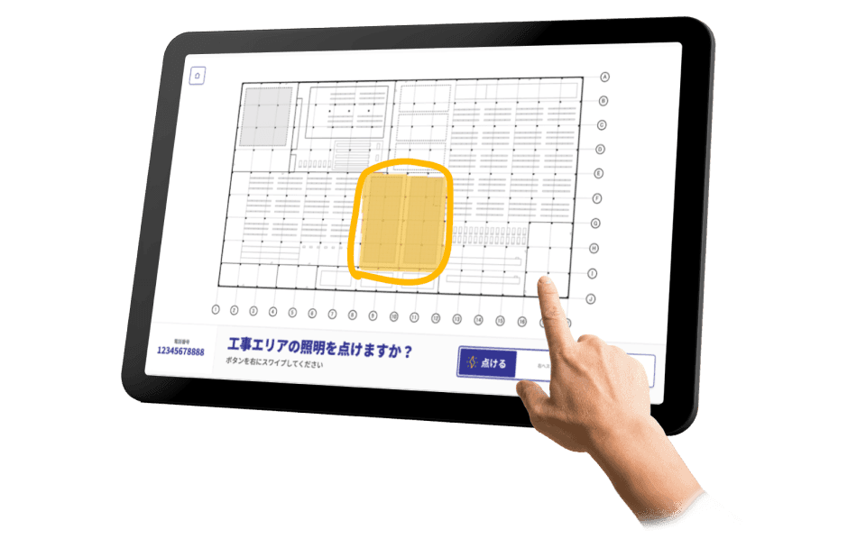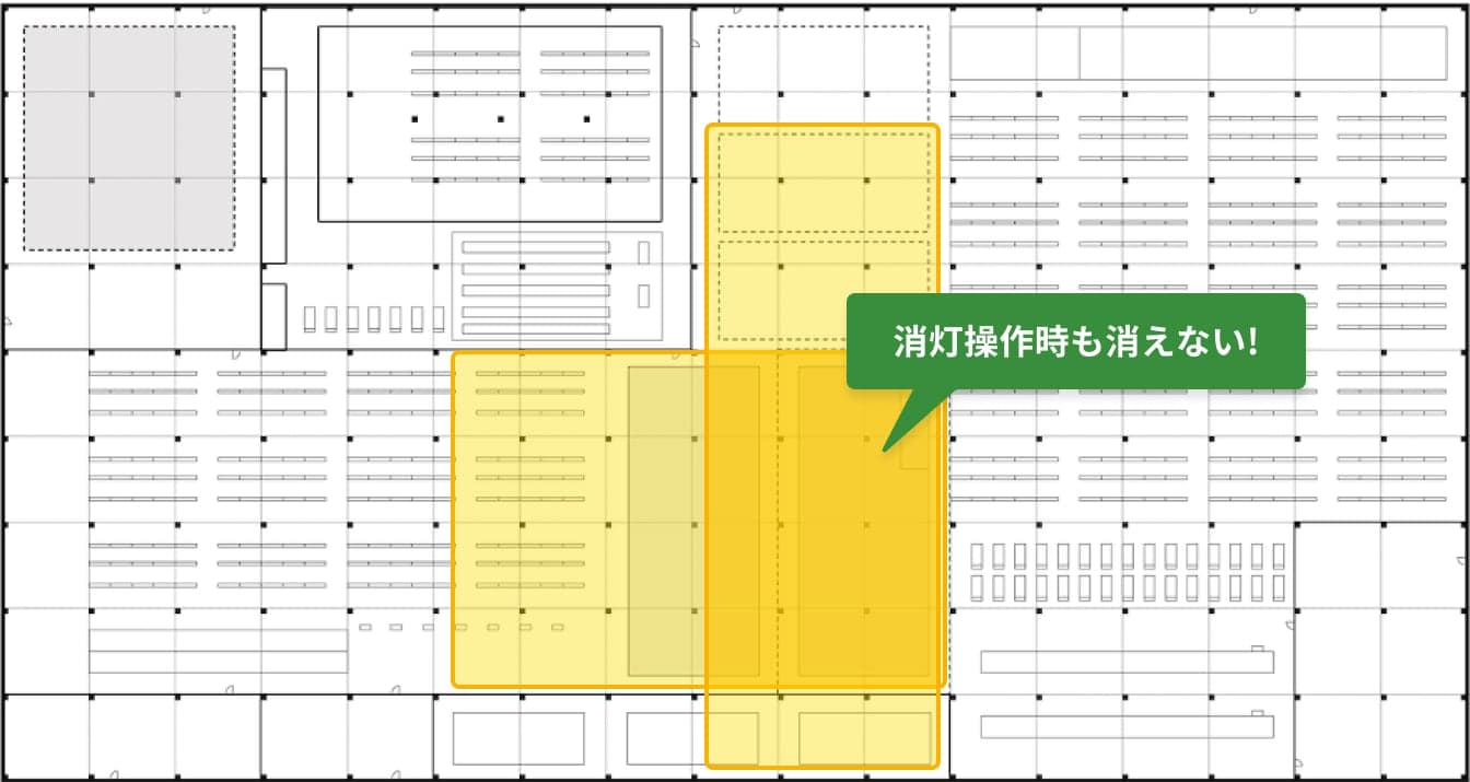 タッチパネルを使用して広い建屋内の任意のエリアを選択し、点灯・消灯操作を行うことができます。これにより、スイッチと点灯エリアの関係を把握する手間が省け、直感的に必要な場所だけを操作でき、効率的な照明管理が可能になります。