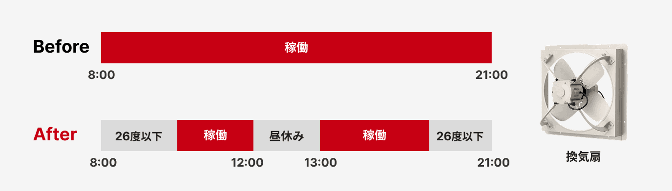 工場建屋内の有圧換気扇の運用において、作業環境の安全確保や排熱処理、CO2濃度などの空気質管理を優先するため、始業から終業まで全台を常時稼働させる「一律運転」が常態化しているケースは少なくありません。