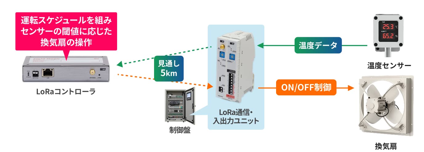 「FieldMagic(フィールドマジック)」はLoRa無線を活用し、大規模な配線工事を行うことなく有圧換気扇の自動制御を実現。電力使用量の削減と管理業務の効率化を達成した取り組みです。