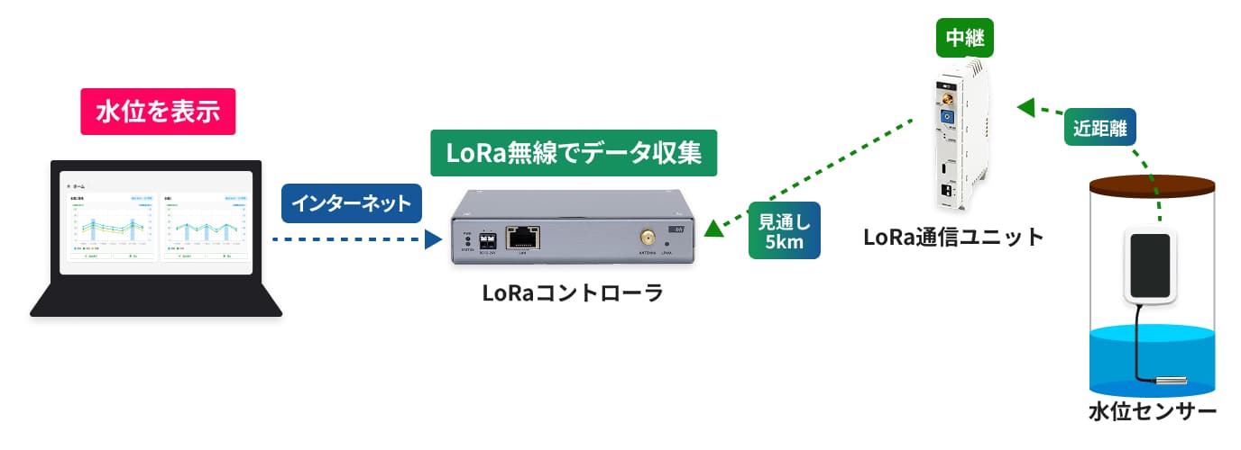 - 電池式センサーで測った水位をLoRaで近くの地上中継機が受信し、親機で集約してLTEでクラウドへ送る。