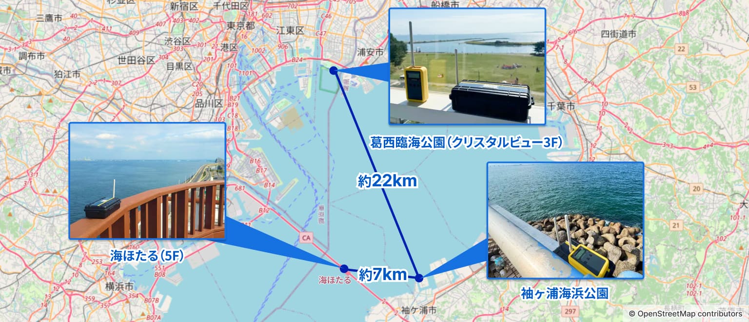 今回の実験では、製品のカタログ記載値5km程度の環境下においてどこまで通信が届くのか、さらなる長距離の実験を東京湾の海上を跨ぐ形で実験を行いました。