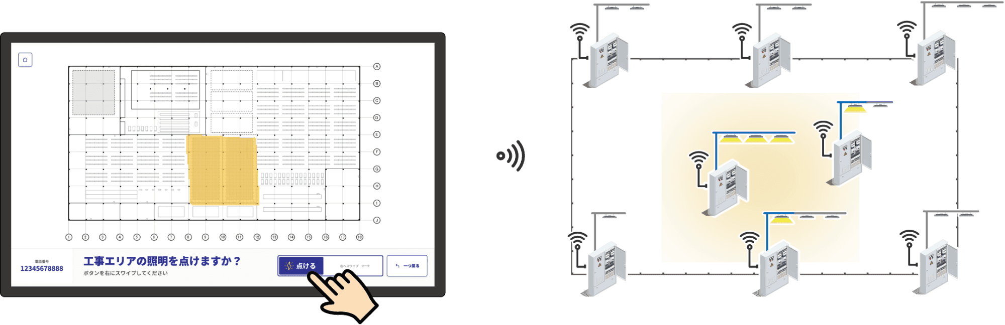 広域施設の照明を直感的な操作でON/OFF。広域無線で大規模施設も安全に制御します。