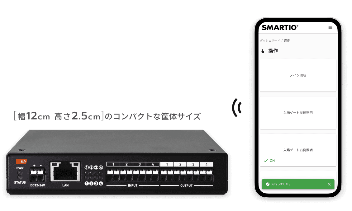 SMARTIO はデジタル入力 4 点、デジタル出力 4 点のリモート設備制御装置です。 PC/スマホからの Web ブラウザ操作に加え、API によるシステム連携が可能です。