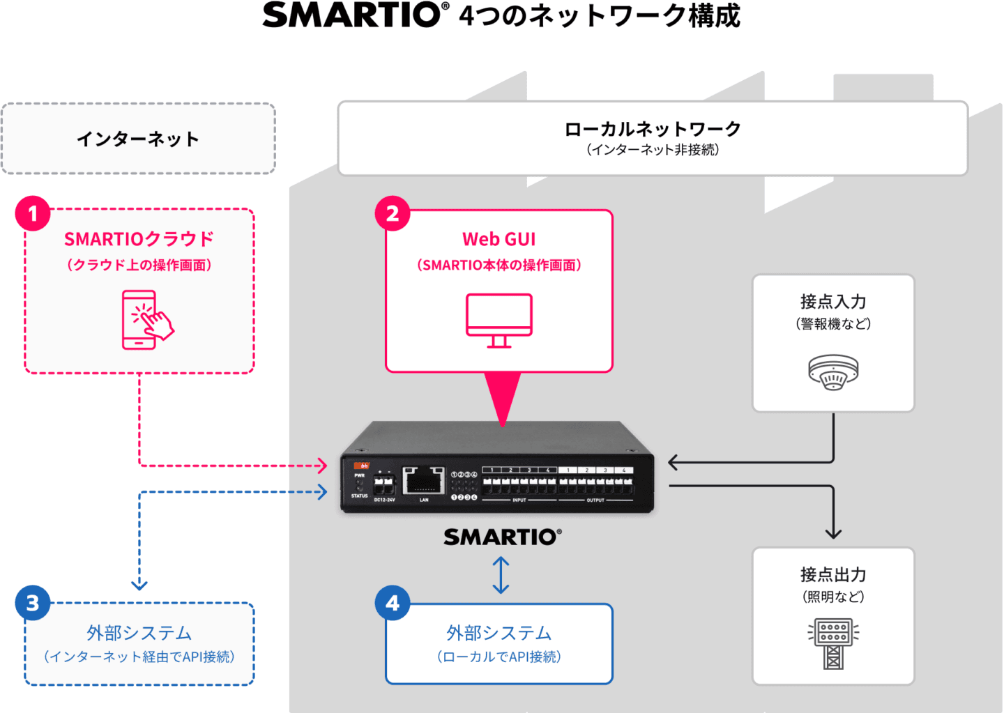 (電気設備の多くは「接点」という制御用端子を備えています。例えば自動ドアでは、押しボタンや人感センサーを接点端子に接続して動作させます。SMARTIOは、4つの接点出力端子と4つの接点入力端子を搭載し、インターネット経由で接点の操作ができます。)