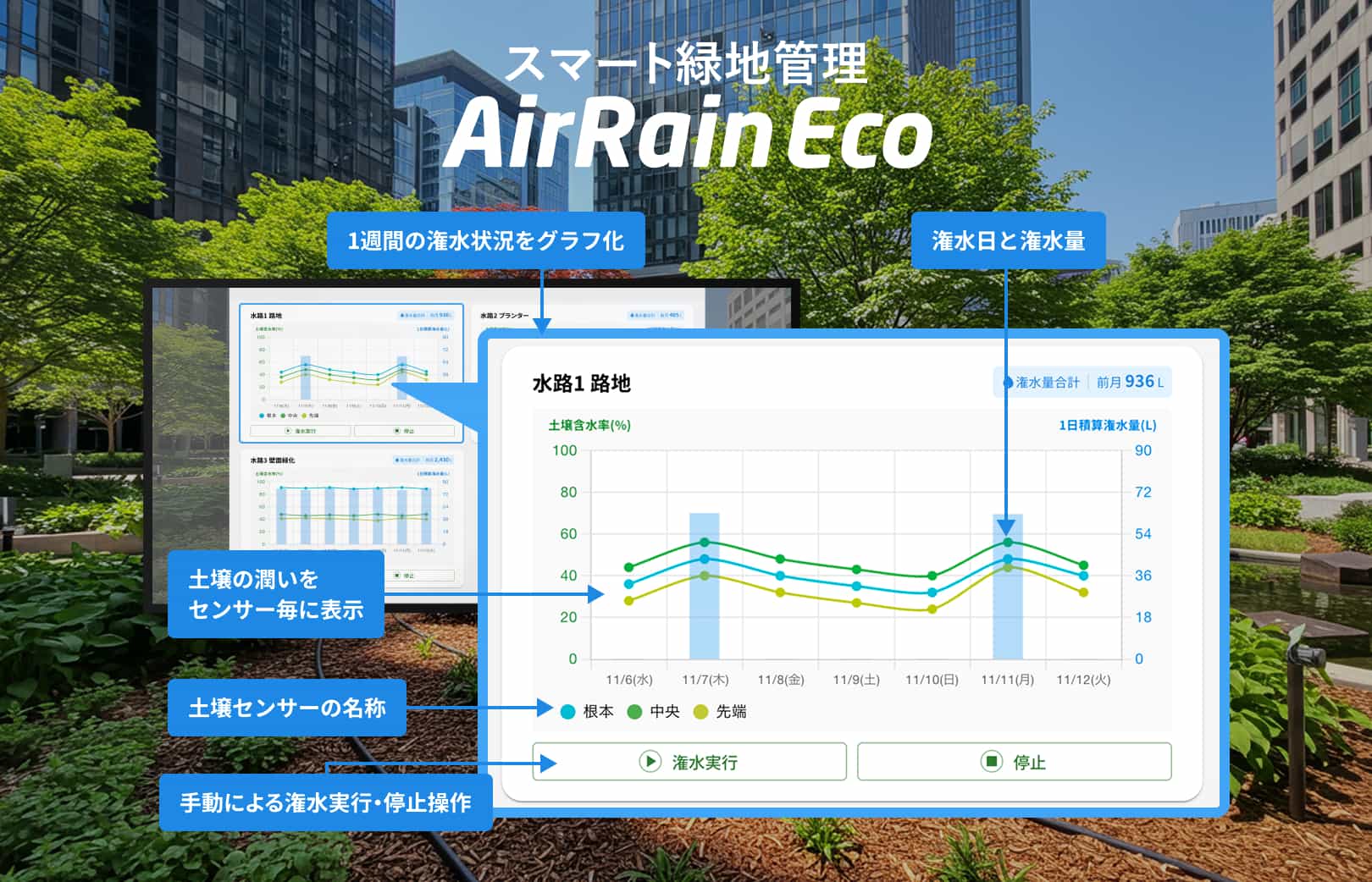 AirRain Ecoは緑地管理をデジタル化したIoT緑地管理システムです。大規模複合施設など、特に都心部における緑地管理に導入効果があり、広域に点在するセンサで緑地状態を数値化し、スマートフォンやデジタルサイネージで可視化。緑地管理業務の自動化に加え、施主/設計者/入居者など施設関係者の緑地維持に対する意識を高め、持続可能な管理を促進します。