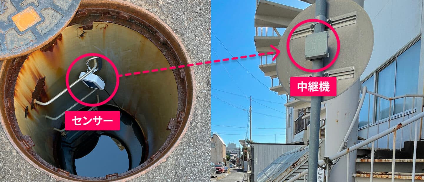 地下から遠距離を狙わず、センサー → 中継機 → 親機の経路で、まず近傍(標識支柱など)の地上で確実にデータを受信。中継機を経由して定期的に水位データを送信・集約します。