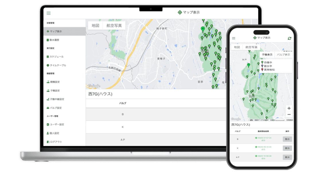 離れた場所にある電磁弁も、PCやスマホから一元管理が可能です。