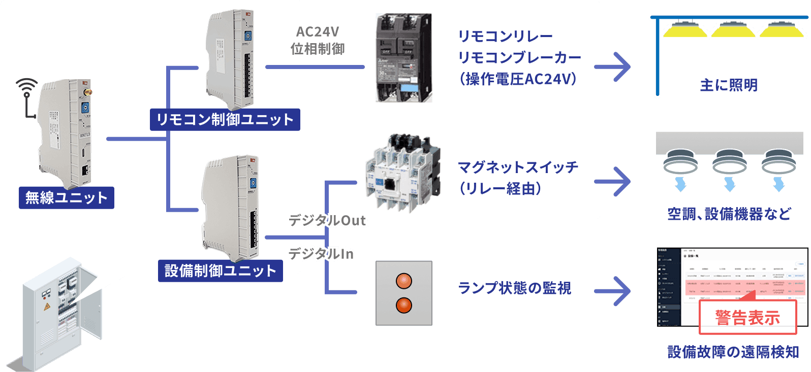 照明だけでなく空調や各種電機設備の制御、複数メーカーのリモコンブレーカーやマグネットスイッチを直接制御します。設備異常ランプを監視し、設備故障も遠隔で通知します。